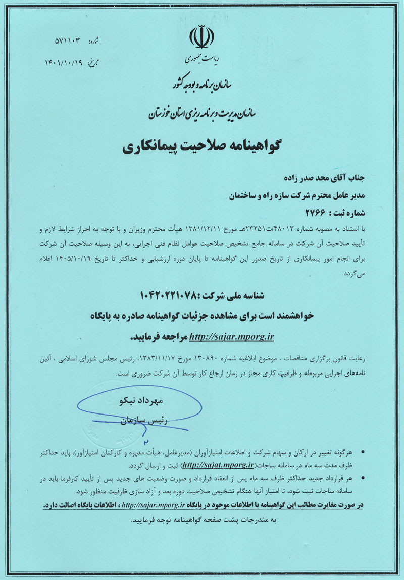 گواهی صلاحیت پیماکاری وزارت کشور، سازمان مدیریت و برنامه ریزی استان خوزستان - 1401