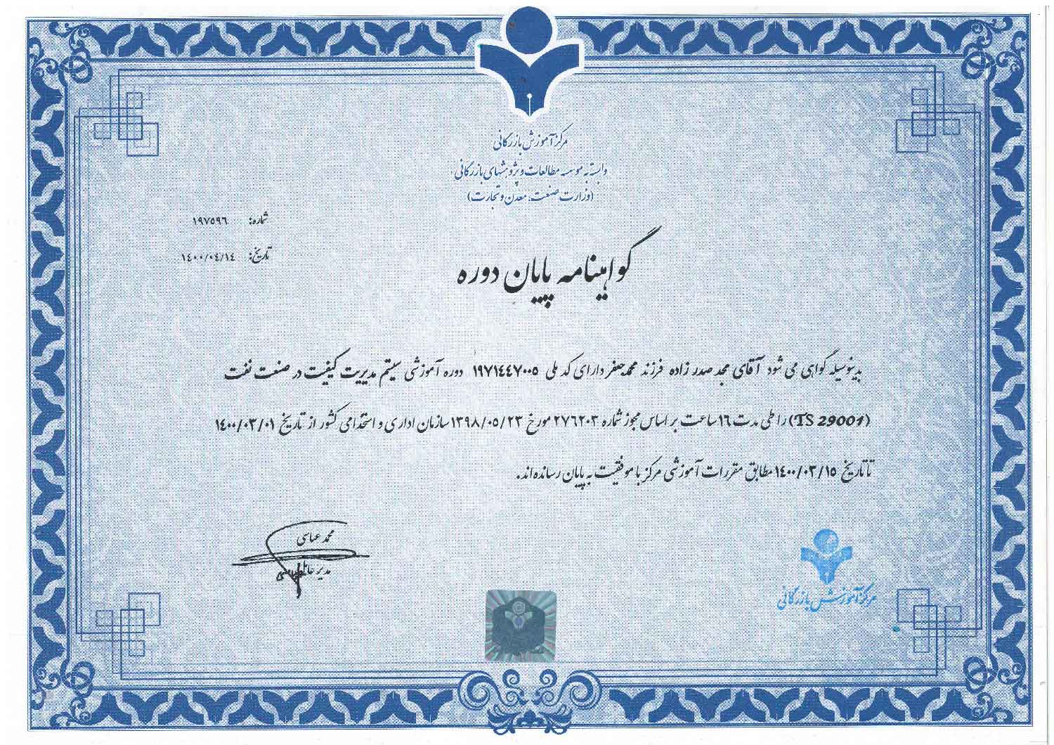 ISO 29001 گواهینامه مرکز آموزش وزارت صنعت، معدن و تجارت