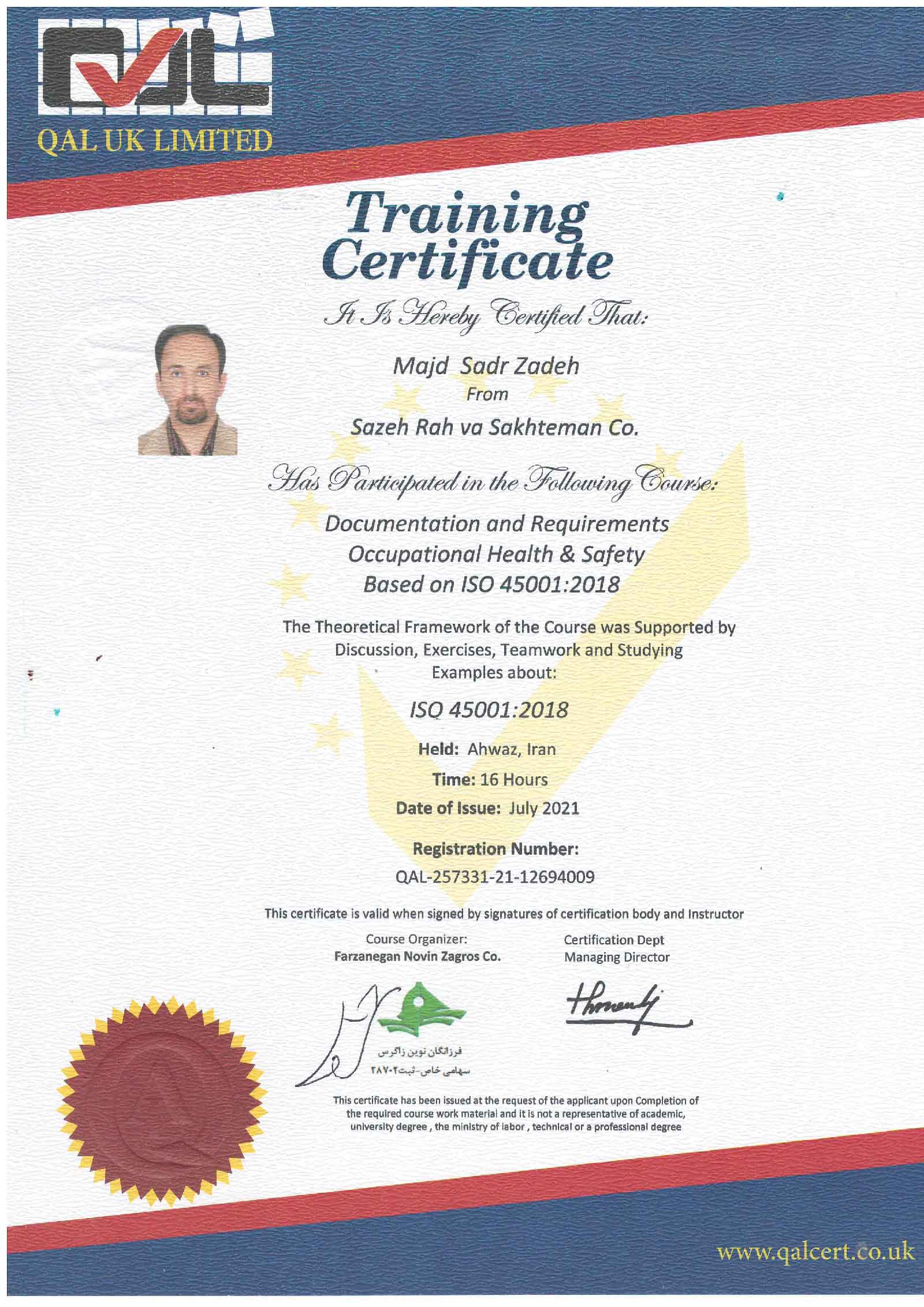 ISO 45001 گواهینامه فرزانگان نوین زاگرس