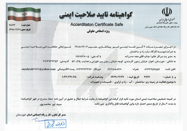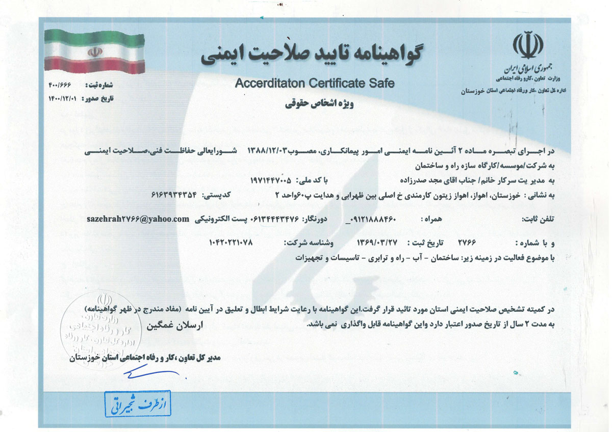 HSE گواهی تایید صلاحیت ایمنی وزارت تعاون، کار و رفاه اجتماعی-1400